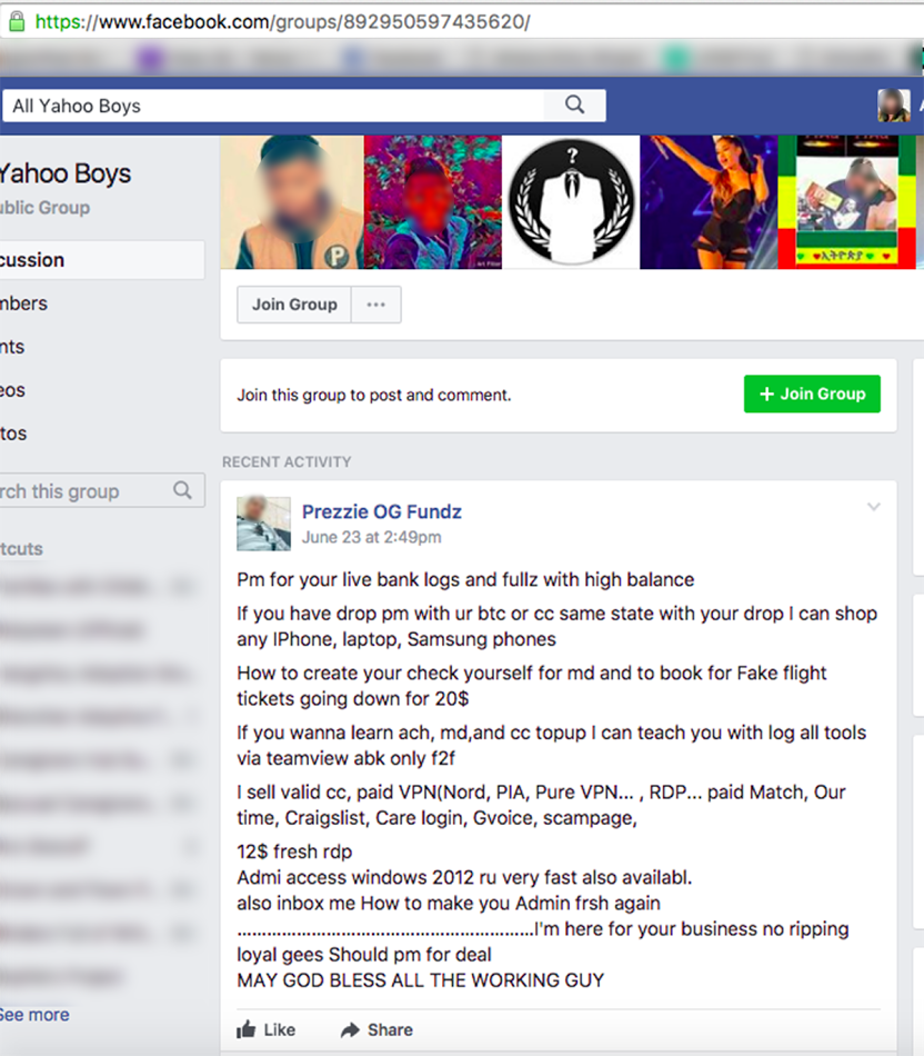 But as soon as one page is removed, another seems to replace it. HuffPost also found this page called Yahoo Boys, which Facebook has since removed. Fraud expert and educator William Kresse said he was “99.99 percent sure that the guy here is advertising himself as dealing in stolen personal financial information.”